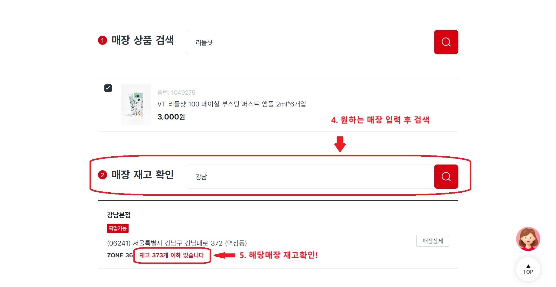 ✓ 다섯번째, 매장 재고 확인칸에 원하는 지점을 입력하고 돋보기 버튼을 눌러주세요.