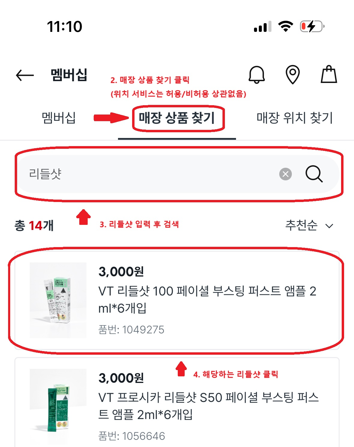✓ 세번째, 매장 상품찾기를 눌러 리들샷을 검색해주세요.