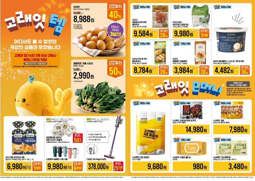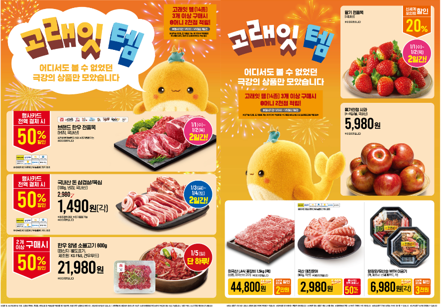 - 1월 3일 ~ 4일: 국내산 돼지 삼겹살/목심 50% 할인 (행사 카드 결제 시)