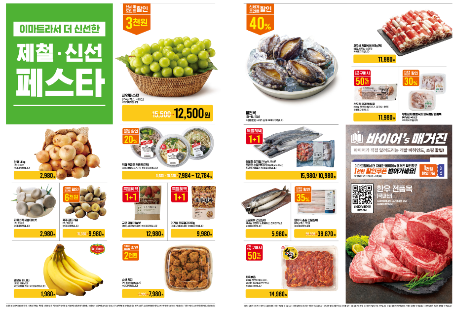 - 신선식품: 한우, 삼겹살, 제철 과일 등 최대 50% 할인