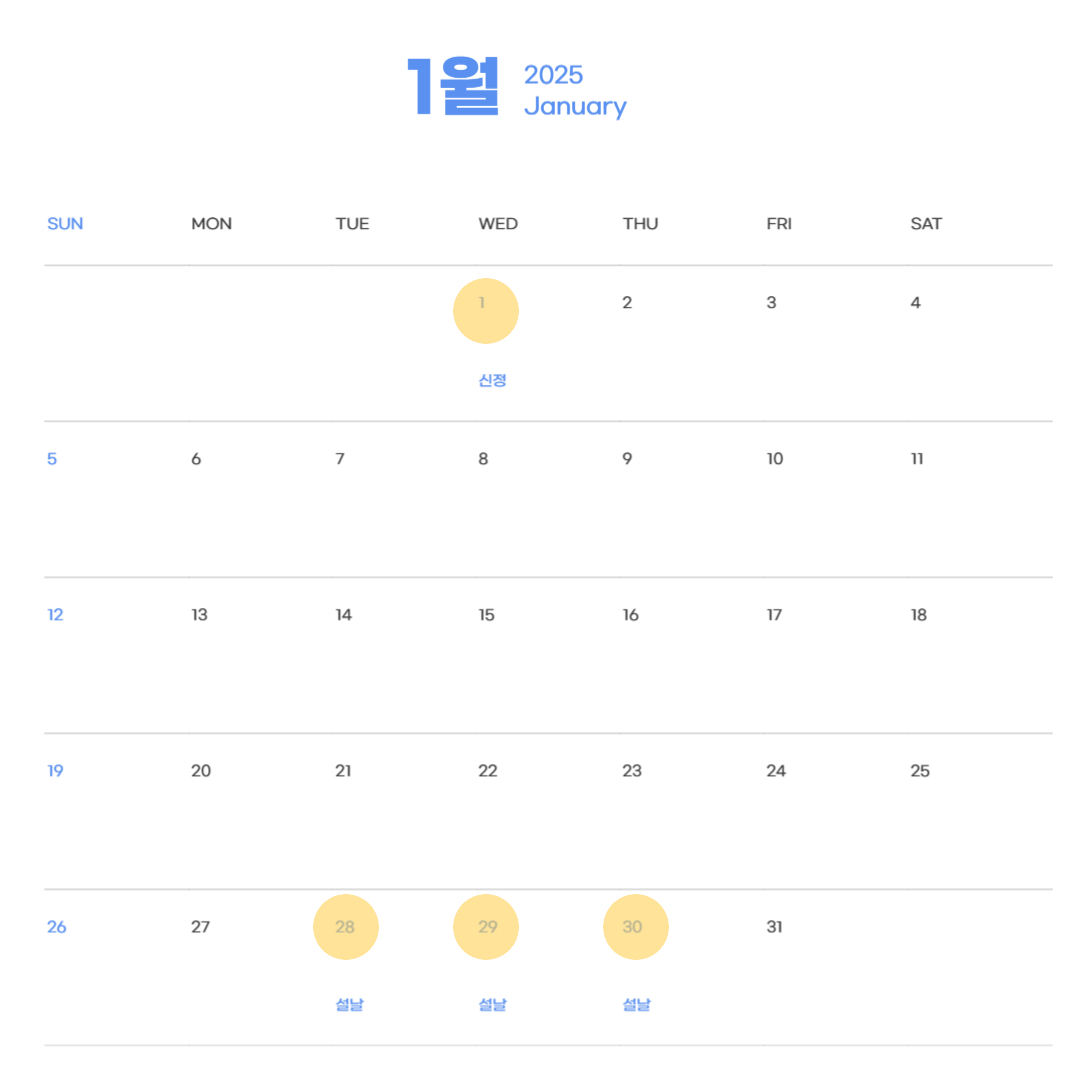 💡1월 설날 연휴: 금요일(1월 31일) 연차를 내면 총 6일 연휴.